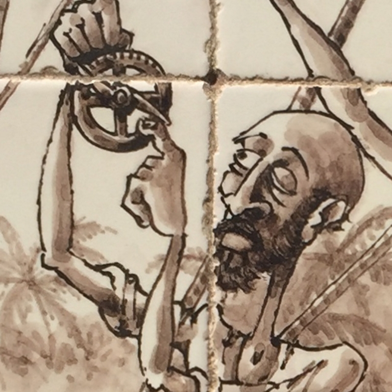 O painel é composto por 42 peças (20 de 7,5cm x 7,5cm, 18 de 7,5cm x 3,75cm e 4 de 3,75cm x 3,75cm), com uma dimensão total de 45cm x 37,5cm (x 1,6mm). A cercadura foi desenhada para esta série. A ilustração, original e única, é inspirada no excerto da "Peregrinação" (de Fernão Mendes Pinto) e que fiz questão de incluir no português coevo.